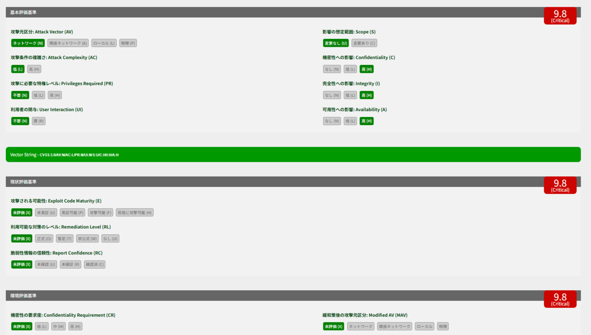・基本評価基準を見ると、9.8(Critical)です。攻撃元区分が「ネットワーク」なので、インターネットから攻撃される可能性があり、非常に危険と言えます。
