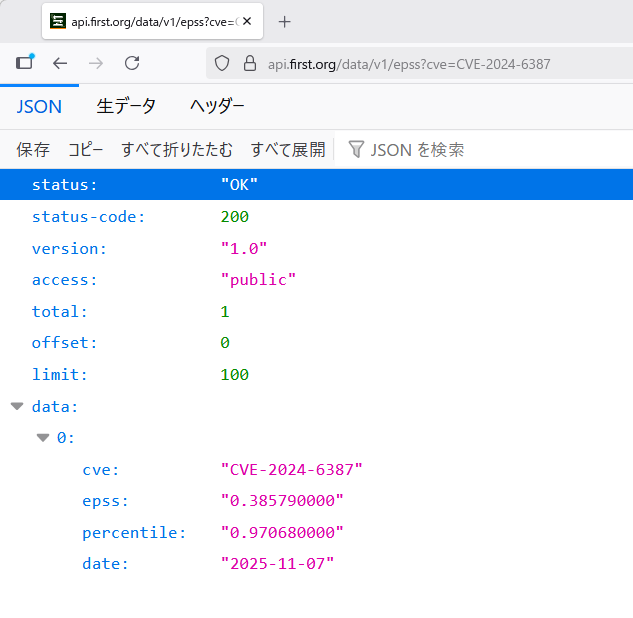 ・例えば,脆弱性PB-1(CVE-2024-6387)であれば,ブラウザのアドレスバーに「https://api.first.org/data/v1/epss?cve=CVE-2024-6387」入力します。